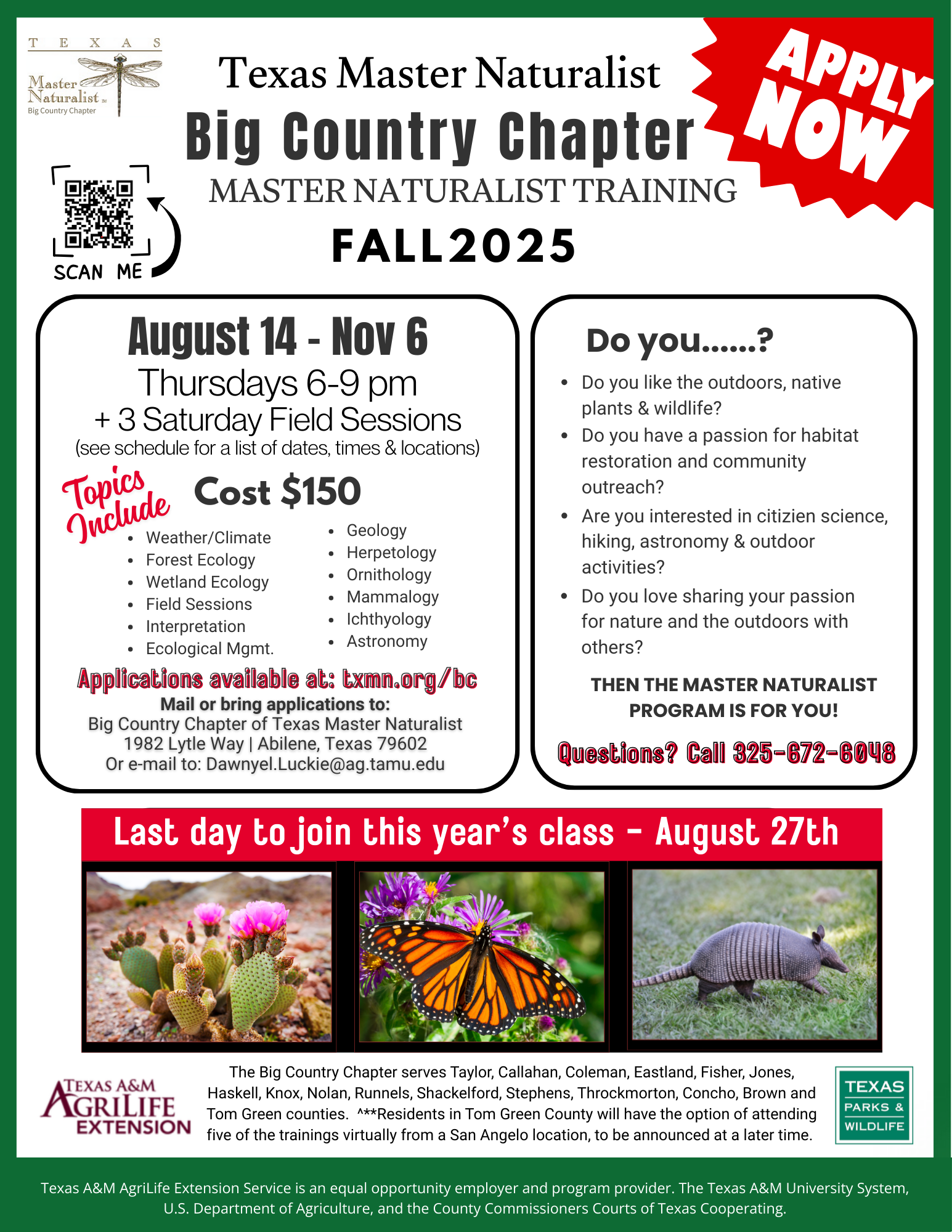 Please see page 3 of the 2025 Master Naturalist application for an example of our 2025 schedule. Big Country Master Naturalist 2025 Training Application