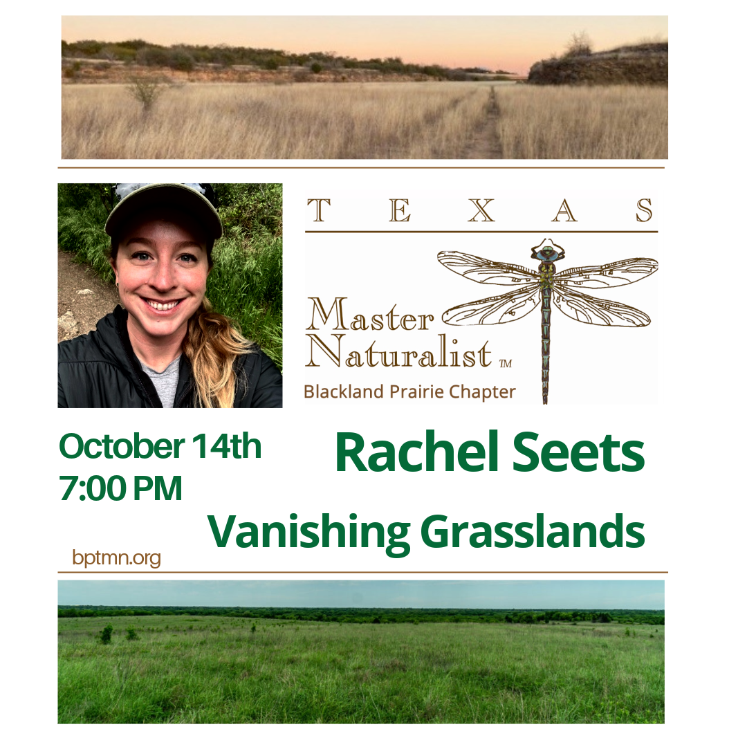 Join us on October 14th at 7 PM. Prairies are becoming a rarity in our state. Only 1% remains of the vast blanket of tallgrass prairie that once swept across North and Central Texas. These remnant grasslands provide essential services and benefits to us–the local human residents–and native wildlife. Native Prairies Association of Texas (NPAT) is working to conserve these incredible landscapes in and around the DFW area through a multi-year project called the North Texas Prairie Initiative. NPAT’s North Texas Conservation Manager, Rachel Seets, will talk about the value of our Texas prairies, how NPAT is conserving them through this initiative, and how you can get involved in prairie stewardship efforts!