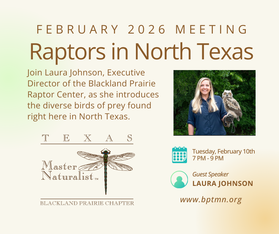 🦅 Presentation: Raptors in North Texas. From the silent flight of owls to the soaring agility of hawks, raptors are vital members of our local ecosystem. Laura will guide us through the species found right here in North Texas, helping us identify them and understand the critical roles they play in our environment.