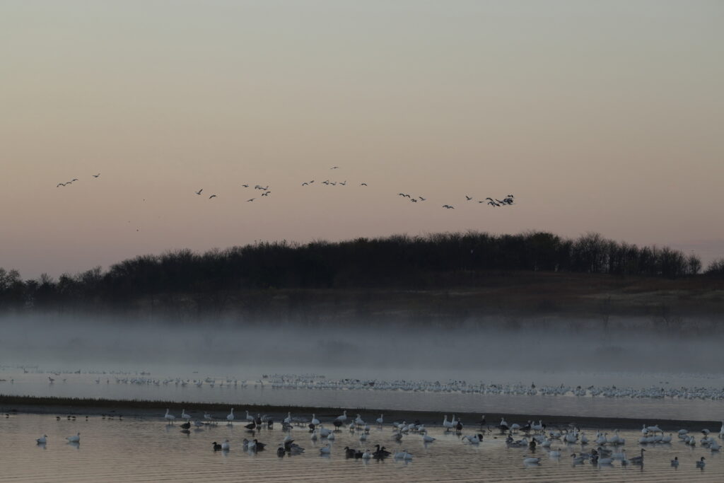 The following morning, the air was cooler, and it was foggy as we headed to Hagerman. The mist hovered over the rolled hay and hills as early rays of soft light fought to shine through the bare branches which were shrouded in the heavy air. Turning onto Refuge Road, it was if driving through a painting called Autumn Road. Browns, yellows, and oranges shown in patches as the remaining leaves held on desperately against the wind. The aquatic foliage along Lake Texoma dotted the landscape with reds, greens, and yellows. The geese swirled through the fog. On the radio, the Bleachers and Bruce Springsteen sung “Because I wanna find tomorrow, Yeah, I wanna find tomorrow, With a girl like you.”