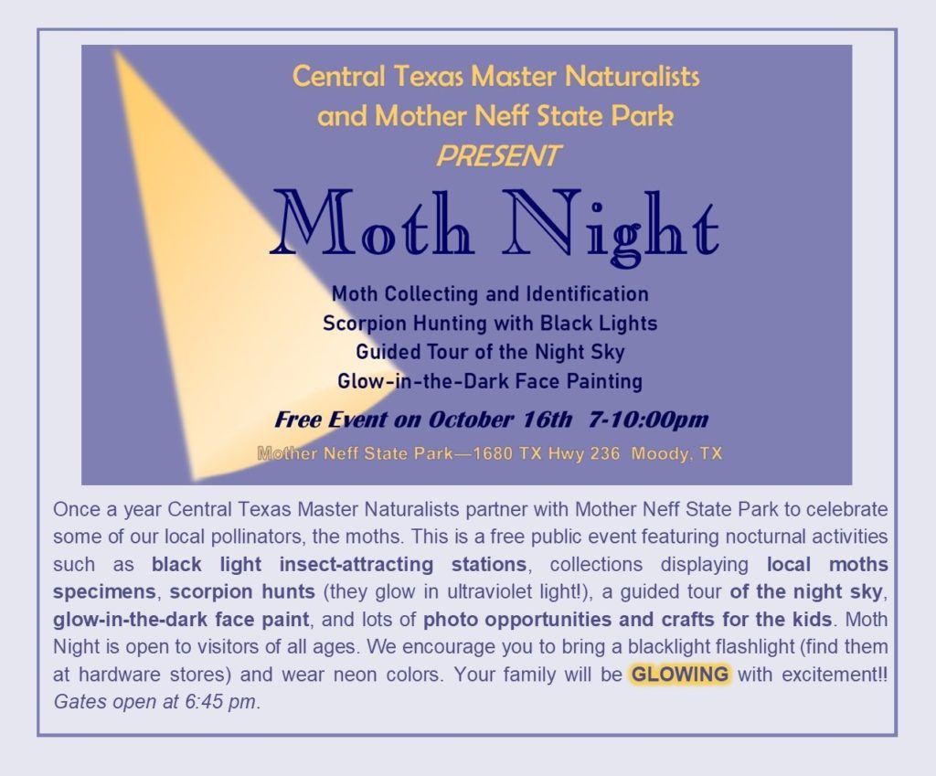 You are invited to visit our monthly chapter meetings to learn about our projects and training opportunities, hear a presentation on Central Texas natural resource topics, and meet our hard-working volunteers. Our meetings are the 2nd Tuesday evening each month at 6:00 p.m. at the Belton Church of Christ (3003 N. Main St) and are open to the public.