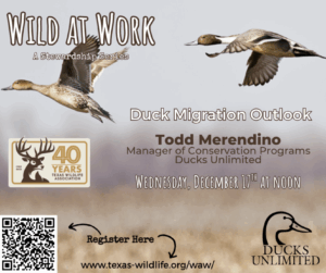Join us as we take a look into how the winter 2025 duck migration is shaping up in Texas, and what hunters and birdwatchers alike can expect for the second split of the season. Todd Merendino, Manager of Conservation Programs at Ducks Unlimited will share current migration data, as well as factors influencing current migration trends. Count as one hour of AT:Miscellaneous lectures and meetings