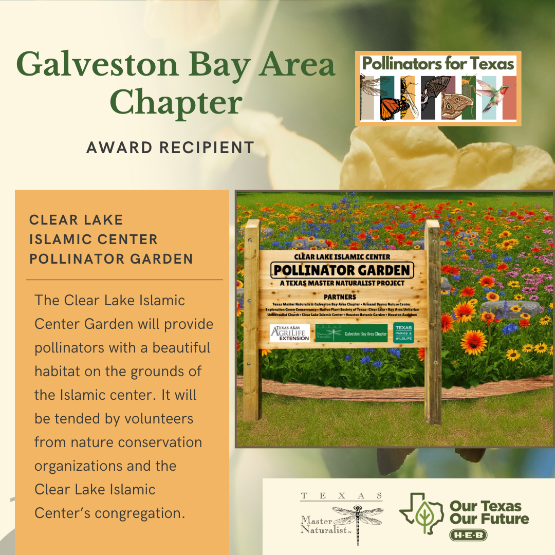 We are excited to announce our participation in the Pollinators for Texas initiative! Our chapter project was selected to receive financial support to enhance native pollinator conservation in our area! Our project, the Clear Lake Islamic Center Pollinator Garden, aims to provide a beautiful habitat for pollinators to enjoy, to be tended by a corps of volunteers including congregants from the Islamic Center, making a lasting impact on pollinator conservation. A big thank you to H-E-B for their generous support in this initiative and collaboration with the Texas Master Naturalist Program. Together, we’re working to safeguard and enhance native pollinator populations across Texas! For more information about Pollinators for Texas visit the website at https://txmn.tamu.edu/pollinators-for-texas/ #PollinatorsForTexas #TexasMasterNaturalist #OurTexasOurFuture.