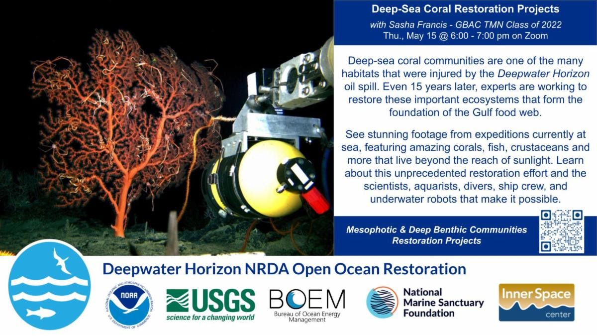 GBAC Member Sasha Francis will give a talk about the restoration of the deep sea corals after the Deepwater Horizon oil spill.