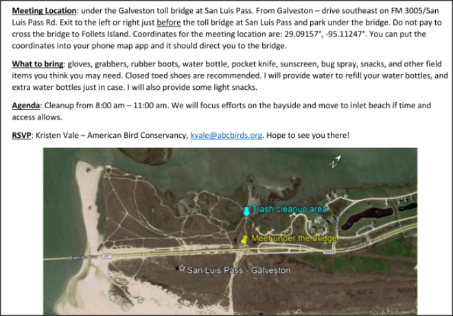 P3 Partnership will begin the fall cleanup season with Kristen Vale of American Bird Conservancy’s request for a San Luis Pass Cleanup on Friday, November 15, 2019. We will meet at 8:30 am and work until approximately 11:30. It’s been too long since our last beach cleanup!