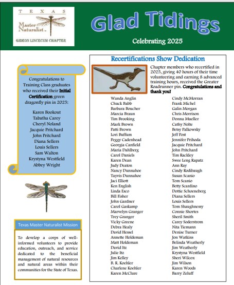 We are glad you are here to learn about the Gideon Lincecum Chapter of Texas Master Naturalists. We welcome you to visit our 20th Anniversary Celebration page to learn more about our history.