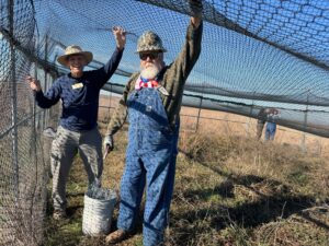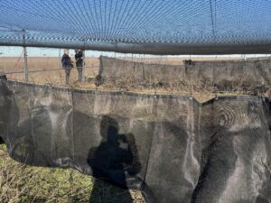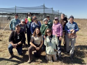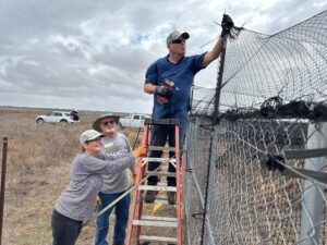 Over multiple workdays, volunteers from both the Coastal Prairie and Gideon Lincecum Texas Master Naturalist chapters, U.S. Fish and Wildlife Service staff, and refuge volunteers came together to repair netting, tighten paracord ceilings, patch holes, remove invasive plants, install predator deterrents such as electric fences and spikes, and reinforce fencing across several pens. Despite frozen fingers, sore knees, and plenty of time spent kneeling in what volunteer leader Jean Stipelcovich dubbed the “pray-ery,” spirits stayed high. Stipelcovich captured the attitude of crews who showed up ready to work no matter the weather perfectly: “Frozen fingers – warm hearts,”. Volunteers participated in morning and/or afternoon shifts, building on one another’s progress with good humor, teamwork, and a shared sense of purpose. By the end of the two weeks, pens were transformed, plans were in place for final adjustments, and most importantly, the refuge is now ready to welcome the next generation of Attwater’s Prairie-Chickens home.
