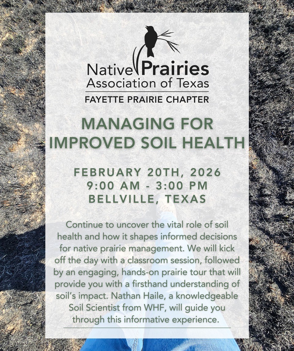 REGISTRATION REQUIRED: https:// texasprairie.org/event/fp- soil-health-workshop-feb2026/