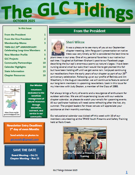 - From the Vice President, Swee Leng Rapatz: November Board Meeting Scheduled at Lake Somerville State Park – Nail’s Creek Unit Pavillion in Lee County