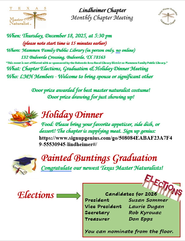 Monthly Chapter Meeting Sign up to bring snacks to the meeting!https://www.signupgenius.com/go/508084EABAF23A7F49-55530945-lindheimer For online meetings: https://us06web.zoom.us/j/7461036858