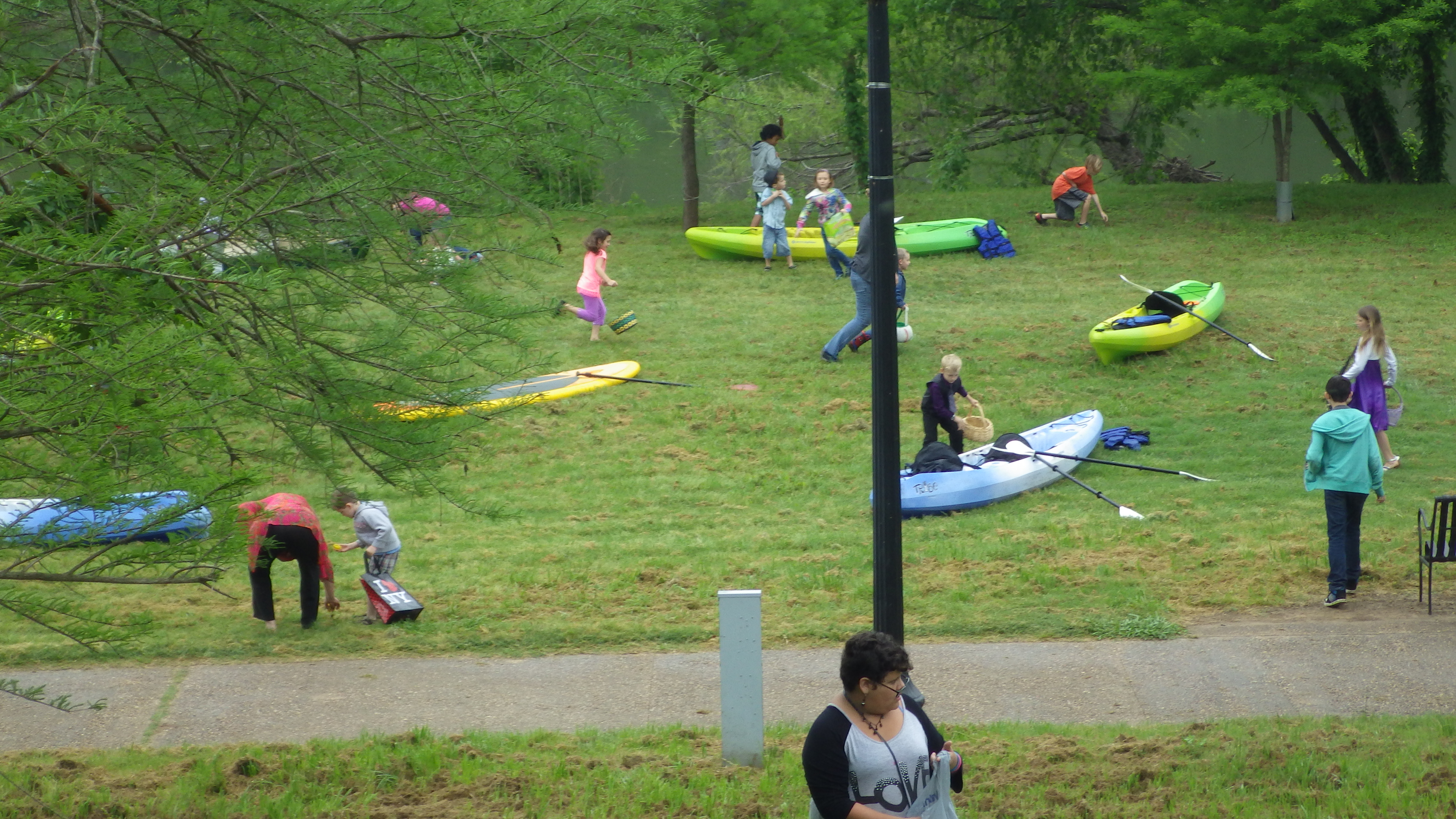 Fortunately when the DJ started the music folks started drifting in. A beer and wine booth was at the bottom of the stairs leading down to Neighbor’s yard, the cook tent was at the other end of the yard and the bandstand in between. Down on the lower yard, Bastrop River Company had set out a dozen canoes and kayaks, in and around which were hidden 400 Easter eggs.