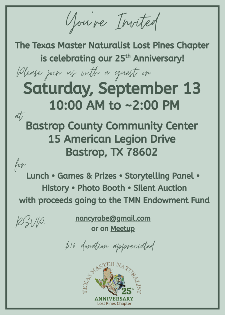 We are thrilled to invite current and former chapter members plus a guest to join us in celebrating a special milestone — the 25th Anniversary of the Lost Pines Chapter of the Texas Master Naturalist program!