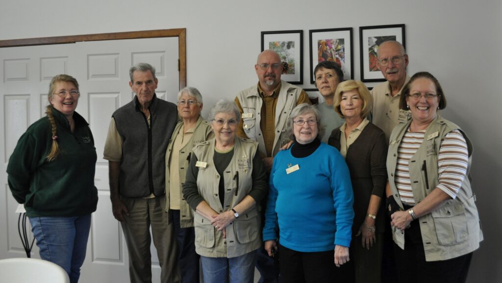 Susan Tullos became the first chapter president (serving continuously from 2010 to 2016), and Susan Moran served as training director and Treasurer. Seventeen members completed training and received their certification at the ceremony in 2010. In fact, all 17 of the initial members completed the requirements for both their certification and recertification hours by the time of the induction ceremony! Of these founding members, 3 remain active: Susan Tullos, Kathleen Applebaum, and Justine Henley. All the past presidents of the chapter have remained active in the chapter, including Timi Maples (2017-2018), Ron Diderich (2019-2021), Nelda Tuthill (2021-2022), Tina Crichfield (2023-2024), and Jessica Jones (2024-2025). In 2024, there were 47 active members, who cumulatively completed over 4500 service hours that year.
