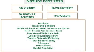 By: Marsha Stephens The fourth annual Nature Fest is in the books! Mother Nature provided a perfect day: not too hot, not too coldβ¦β¦.and not too windy, always a plus in Texas…. Read More →