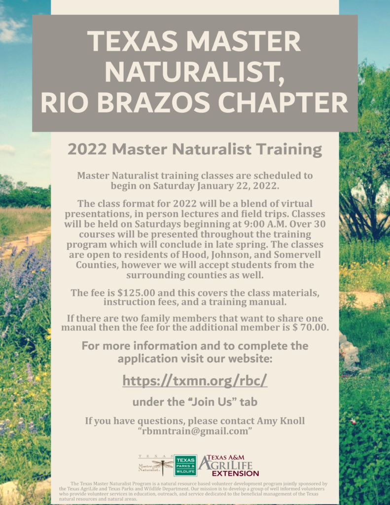 The chapter’s training course follows the Statewide Curriculum and Basic Training Guide and focuses on Texas landscapes and local ecosystems. Classes are designed to provide trainees with the basic knowledge and skills to serve as volunteers in the chapter area’s parks, natural areas, chapter learning events for the public, partner events, and more. Class instructors include biologists, botanists, ecologists, geologists, and other natural resource experts from local, state, and federal agencies; universities; and the private sector. The cost is $125 for class materials, instruction, manual, and first year’s dues ($25 annually).
